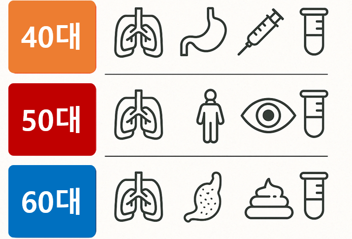 40대는 특히 암 발병률이 매우 높아지는 시기로 암 관련 진료에 대해 집중할 필요성이 높습니다. 여성은 유방암이 남성은 대장암의 위험성이 높아지기 때문에 주의할 필요가 높습니다.