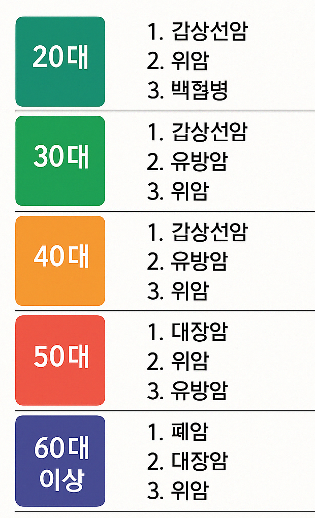 | 1위 | 갑상선암 | 갑상선암 | 갑상선암 | 대장암 | 폐암 |